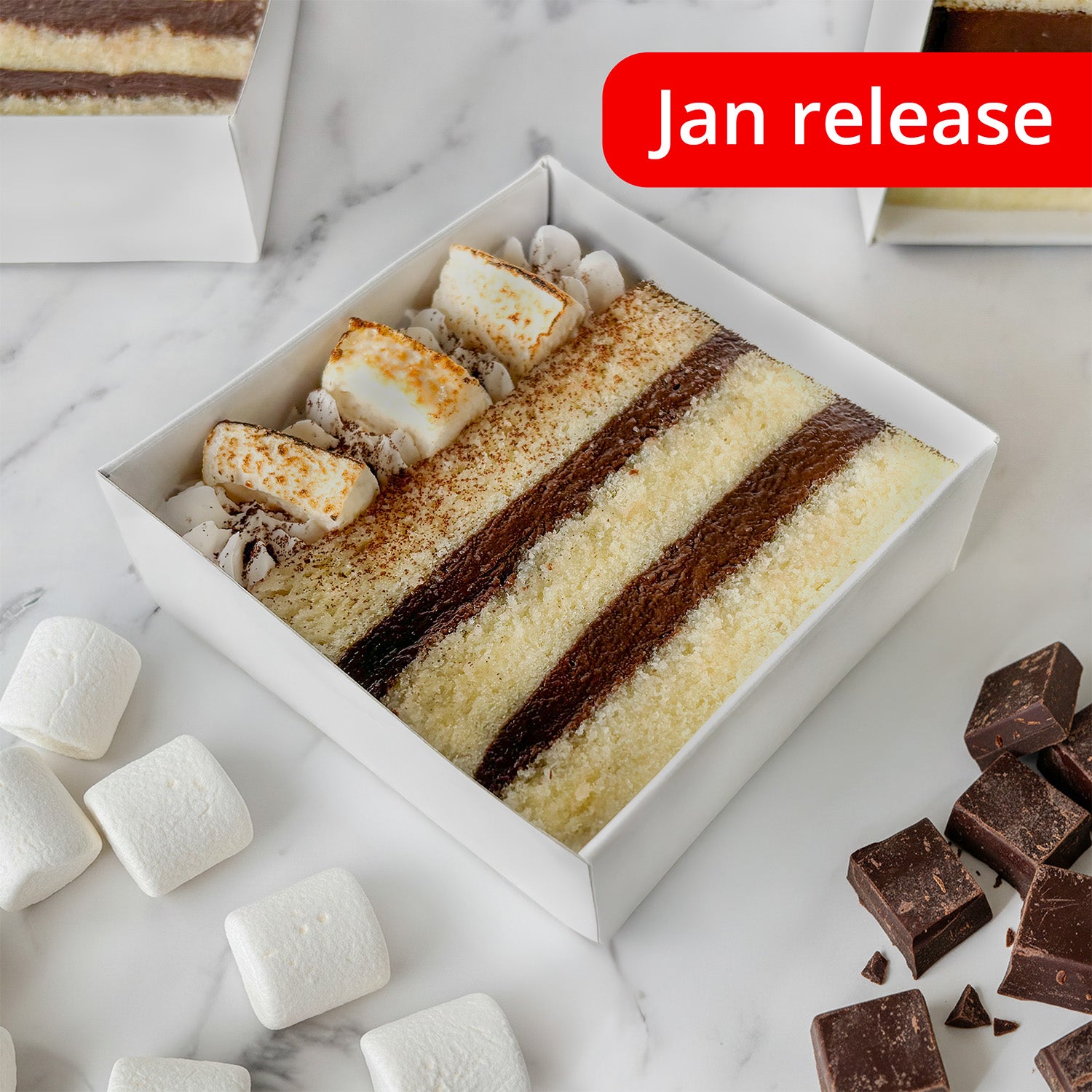 Flour (Gluten), White sugar, Eggs, Milk, Water, Whipping cream (Milk), Cocoa powder, Marshmallows, Butter (Milk), Egg yolks, Vanilla flavoring, Baking powder, Salt
