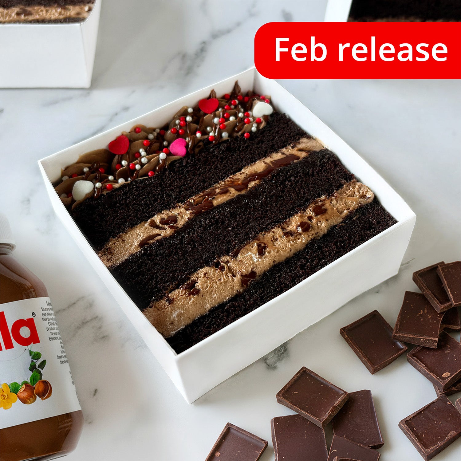2 Nutella cake slices layered with Nutella frosting between chocolate cake and finished with a Nutella drizzle