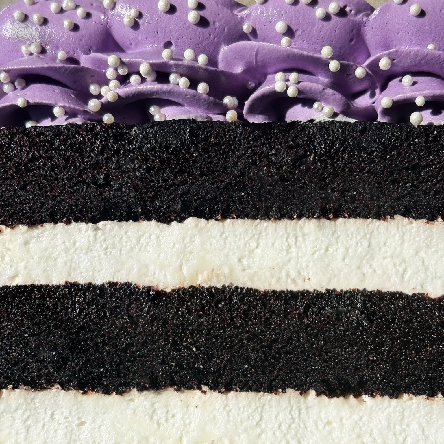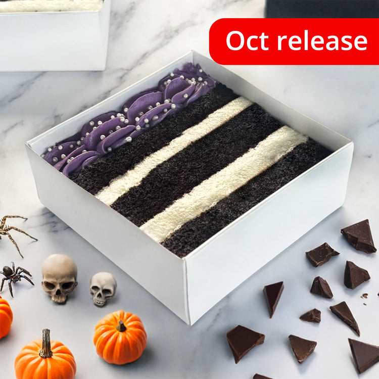 2 Purple Nightmare cake slices swirled with white chocolate ganache in a deep spooky chocolate base.